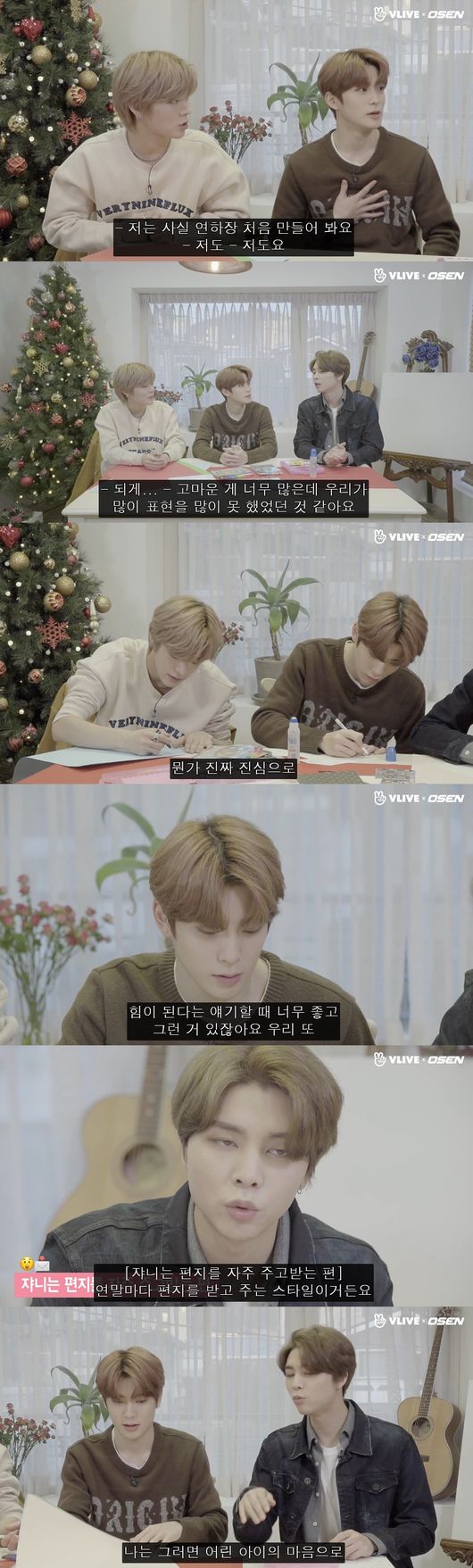 멤버들은 "팬들과 부모님, 멤버들과 친구들 등 쓰고 싶은 사람 많다"며 누구에게 쓸지 고민, 하지만 너무 많은 인원이 되기에 3명이 각각 나누기로 했다. 유타는 멤버들에게, 재현은 팬들에게, 쟈니는 멤버 부모님들에게 써보기로 정했다. 세 사람은 "고마운 것이 많지만 표현을 많이 못했다, 좋은 마음을 담아보자"면서 자기 스타일대로 꾸미기 시작했다. 유타는 "아트타임을 가져보자"며 핑크를 선택해 웃음을 안겼다. 쟈니는 "어린 아이의 마음을 담을 것, 어른들은 우리 볼때 어릴 때 모습이 생각날 것 같아 크레파스로 써야겠다"며 귀여운 발상을 하기도 했다. 한 명씩 편지를 적으면서 "편지 감성이 좋다, 우리가 말을 많이 안할 때 말로 전하지 못하는 진심을 전달하는데 의미가 있다, 마음이 뜨거워진다"면서 "편지는 문자와는 다른 느낌, 정성이 들어가서 그렇다, 그 사람 감정이 느껴져"라며 편지쓰기에 빠져들었다.
