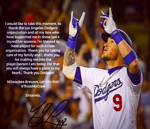 밀워키 브루어스로 이적한 포수 야스마니 그랜달(31)이 전 소속팀 LA 다저스에 감사의 작별 인사를 전했다.