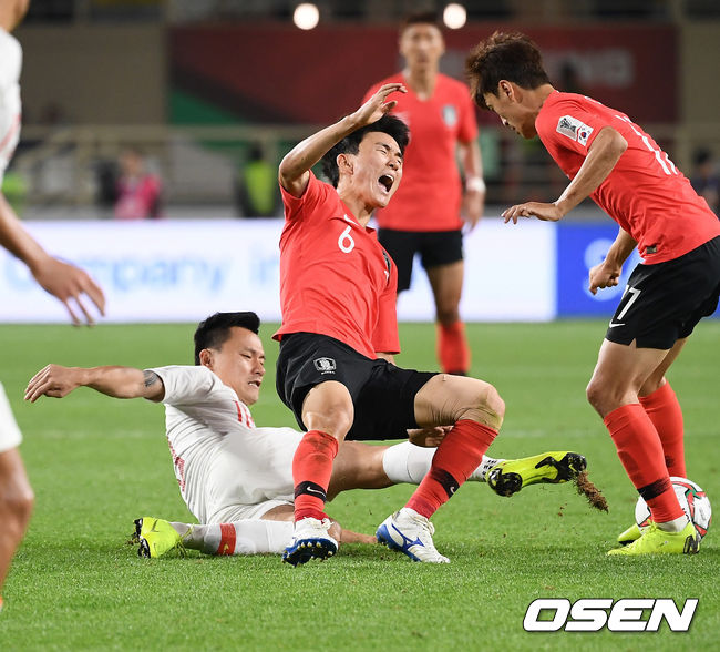 한국은 17일(한국시간) 새벽 아랍에미리트(UAE) 아부다비의 알 나얀 스타디움서 끝난 중국과 2019 아시아축구연맹(AFC) 아시안컵 조별리그 C조 최종 3차전서 전반 황의조(감바 오사카)의 페널티킥 결승골과 후반 김민재(전북)의 헤딩 추가골에 힘입어 2-0으로 승리했다. 이로써 한국은 3연승으로 중국(2승 1패)을 따돌리고 조 1위로 16강에 오르게 됐다.