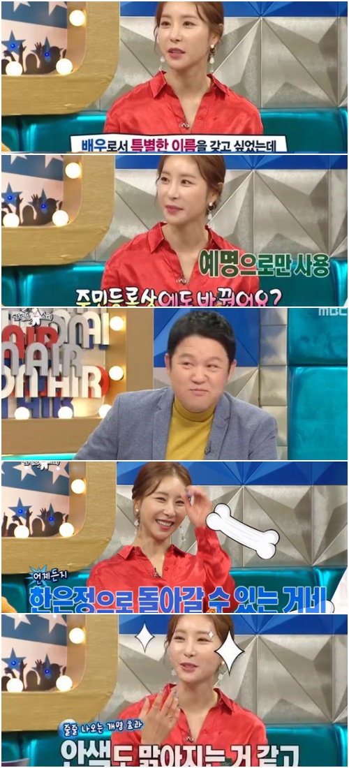 하지만 주민등록상 이름은 바꾸지 않았다고. "신진대사가 원활해지면 호적도 바꿀 것"이라고 전했다. 이를 들은 MC 김구라는 "그렇다면 언제든지 다시 한은정으로 돌아갈 수 있다"라며 다소 안심(?)하는 듯한 모습을 보여 웃음을 자아냈다.