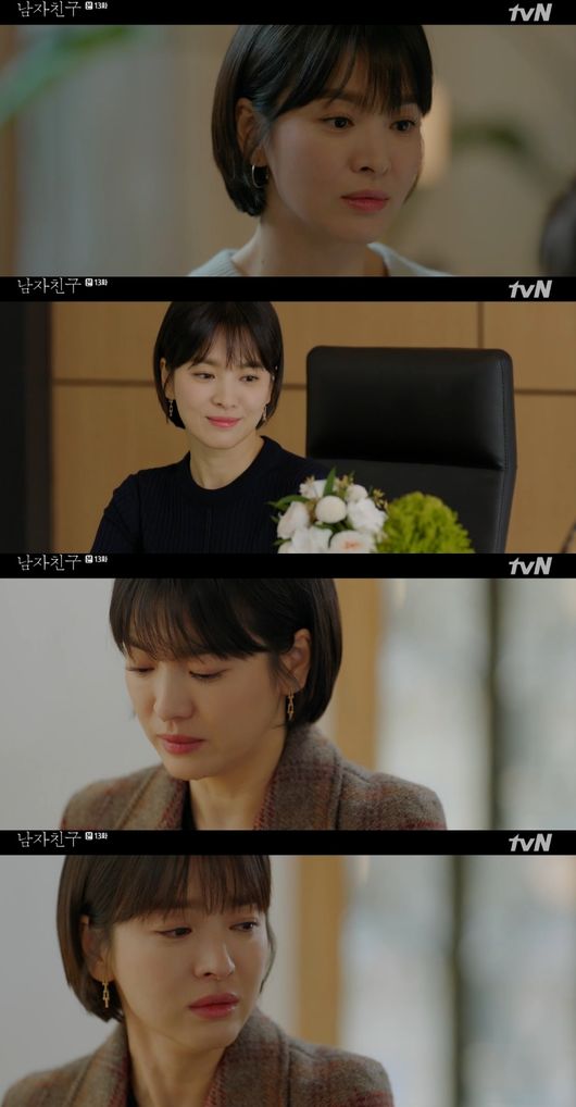 누군가에게는 평범한 일이 누군가에게는 꿈처럼 아득한 일이 될 수 있다. 평범함의 행복을 누구보다 절실하게 알고 꿈을 꾼 그녀이기에, 그 평범함을 깨지 말아 달라는 간곡한 부탁에 아무 말도 하지 못하고 눈물을 흘릴 수밖에 없었다. 지난 16일 방송된 tvN 수목드라마 ‘남자친구’(극본 유영아/연출 박신우) 13회 속 송혜교(차수현 역)의 눈물이 시청자들의 마음까지 아프게 만들었다.