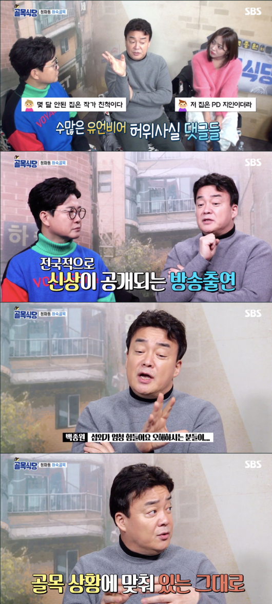 마지막으로 백종원은 "몇달 안된 집은 작가 친척이라고 하는데, (사실이라면) 고발하시면 된다"며 "반대로 그런 유언비어 퍼뜨리시면 저희가 고발한다"고 강조했다.