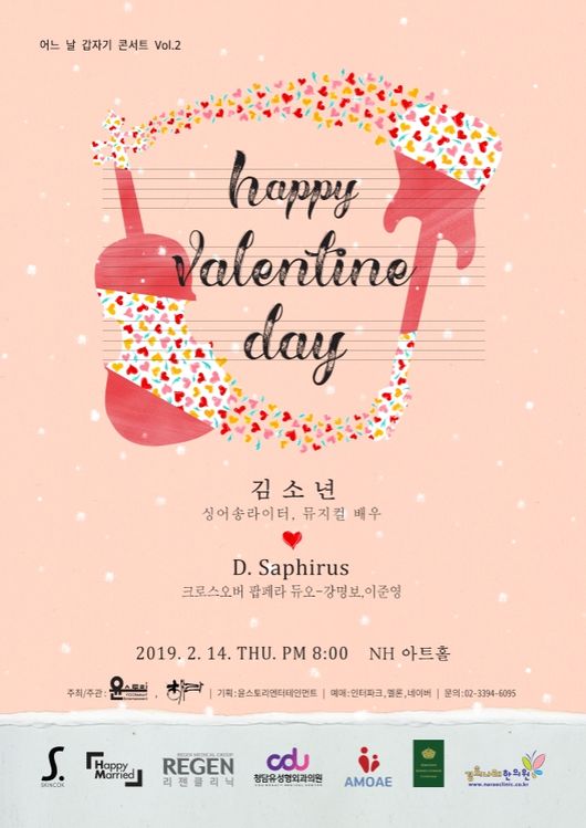 ‘해피 발렌타인 데이’ 콘서트에는 가수 겸 뮤지컬 배우로 활동 중인 김소년을 비롯해 테너 강명보, 바리톤 이준영으로 구성된 팝페라듀오 등이 참여할 예정이다.