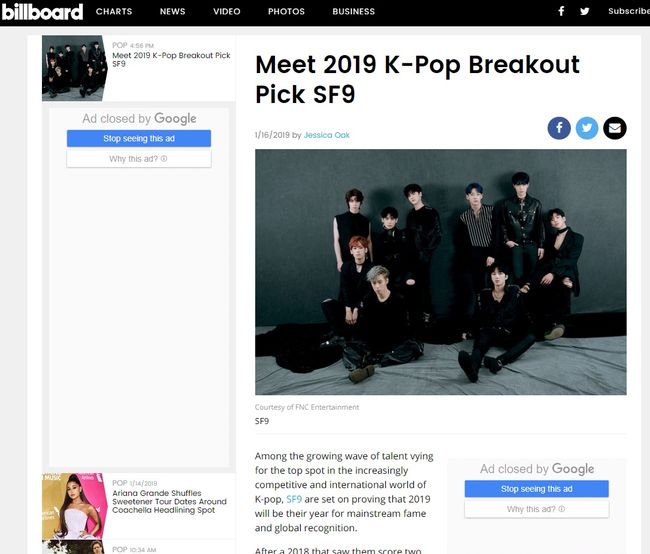 빌보드는 16일(현지시간) ‘2019년 반향을 일으킬 K팝 그룹, SF9(Meet 2019 K-Pop Breakout Pick SF9)’라는 제목의 칼럼을 게재하고 SF9을 단독으로 집중조명했다.