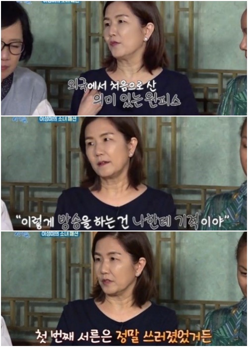 이성미는 지난 16일 방송된 TV조선 예능프로그램 '두 번째 서른'에서 멤버들과 실제 서른 살에 입었던 옷을 다시 입어보며 '첫 번째 서른'을 추억하는 시간을 가졌다. 35년 전 일본에 갔을 때 샀다는 옷이지만, 여전히 늘씬한 몸매를 과시해 눈길을 사로잡았다. 이성미는 "일본에 갔을 때 산 옷이다. 그 때 이 옷이 좀 비쌌는데 사고싶었다. 외국에 나가서 처음으로 산 옷이라 간직하고 있다"고 말했다.