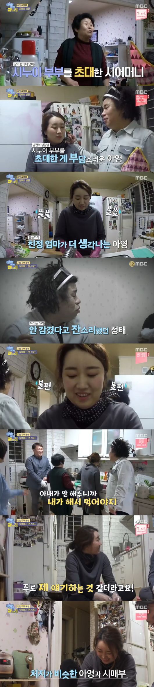 아영은 서둘러 요리를 시작했다. 이어 시누이네 부부가 바로 도착했다. 시매부가 시母를 위한 건강효소액을 선물해오자 아영은 정태에게 "여보도 좀 배워서 우리 엄마 선물 좀 해봐"라며 부러워했다. 가족들 이야기 중에, 아영이 요리를 하기위해 일어났다. 왠지 친정母가 더욱 생각나는 듯 해보였다. 이때 시매부도 함께 요리를 돕기 위해 부엌으로 나갔다. 알고보니 시母도 인정하는 수준급 요리실력을 가지고 있다고 했다.