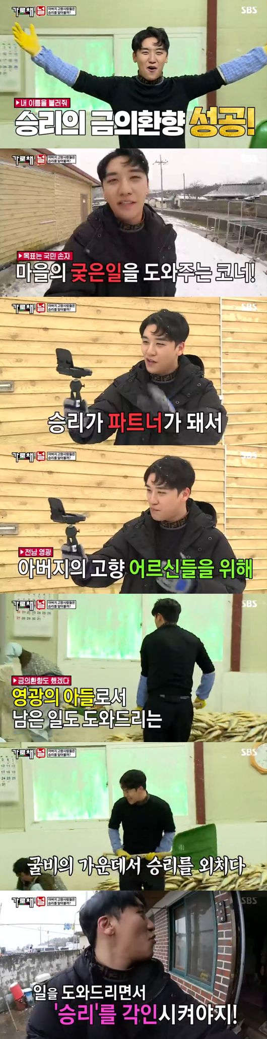 일을 도와주며 승리란 이름을 각인시키며 어필할 것이란 계획이었다. 굴비엮기에 이어, 소 밥주기에 도전, 직접 발로뛰는 준비된 국민손자 모습이었다. 이에 끝내지 않고 父고향에서 유명한 전남영광 굴비를 홍보하기 위해 편곡에 녹음까지 직접하며 뮤비까지 제작해 눈길을 끌었다. /ssu0818@osen.co.kr