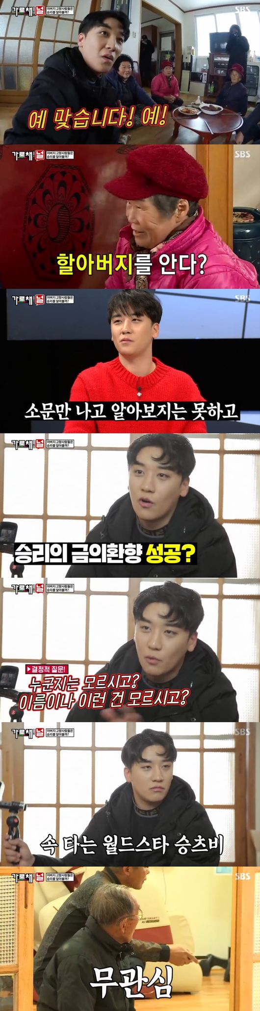 승리는 알고있는 가수를 묻자, 어르신들은 최불암을 언급, 젊은 가수를 말하며 유도심문을 했으나 어르신들은 알아보지 못했다. 승리는 자신의 父를 언급하며 고향이라고 했다. 父의 이름을 대자, 어르신들이 조父를 알아봤다. 이 분위기로 승리를 알아볼까 궁금 "그 아들이 가수를 한다더라"면서 가수라고 소문이 났다고 했다.
