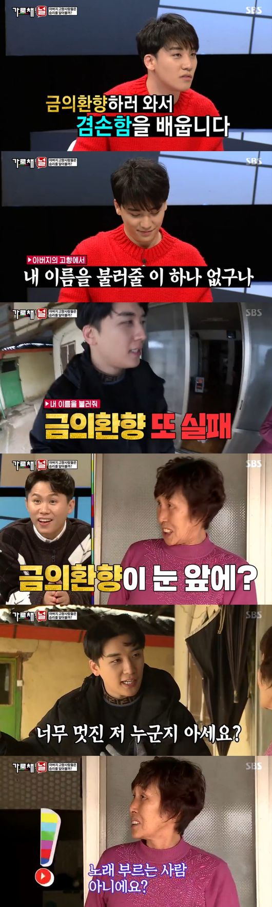 승리는 포기하지 않고 스무고개식으로 유도심문, 자신에 대해 "세계적으로 활동한다"고 소개했다. 하지만 어르신들은 이에 궁금해하지 않고 승리父에 대해 궁금해 해 웃음을 안겼다. 작전을 변경해 승리가 노래를 부르기 시작했다. 하지만 모든 무반응, 무관심에 민망한 기운만 돌았다. 자신만만한 처음과 달리 무거운 발걸음을 옮겼다. 승리는 "고향마을까지 전파가 안 된 걸 보니 더욱 더 열심히 해야겠다"면서 "금의환향 하러 와서 겸손함을 배웠다"고 소감을 전했다.