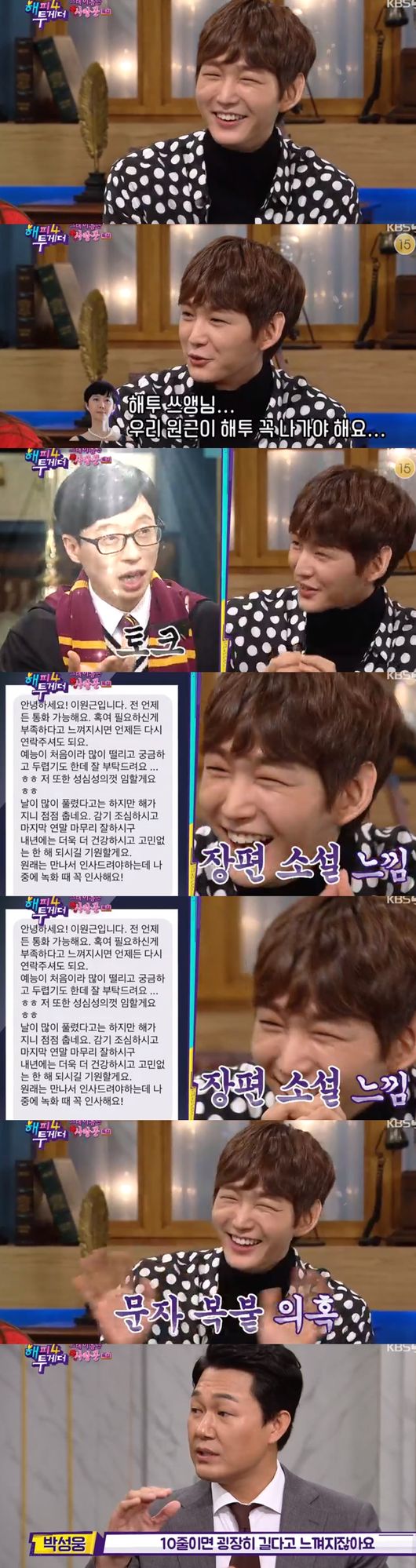 유재석이 "이름만 바꾸고 비슷하게 보낼 법 하다"고 의혹을 제기하자 "아니다"라고 미소를 지었다. 이원근은 "저는 일거수일투족을 애인에게 다 말해주는 스타일이다. 궁금해하기 전에 다 말해주는 스타일"이라고 설명했다.