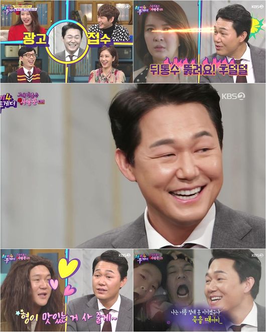 KBS 2TV ‘해피투게더4’(이하 ‘해투4’)의 지난 17일 방송은 ‘그대 이름은 사랑꾼’ 특집으로 꾸며졌다. 이날 방송에는 유호정-박성웅-이원근-하연수-채수빈이 출연해 끈끈한 의리를 과시함과 동시에 포복절도할 웃음을 선사했다. 이 가운데 박성웅의 맹활약이 안방을 웃음으로 흔들었다.