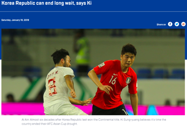 아시아축구연맹(AFC) 홈페이지는 19일(한국시간) '59년 동안 우승하지 못했지만 이제 아시안컵 우승 가뭄을 끝낼 것이다'는 기성용의 인터뷰를 보도했다.