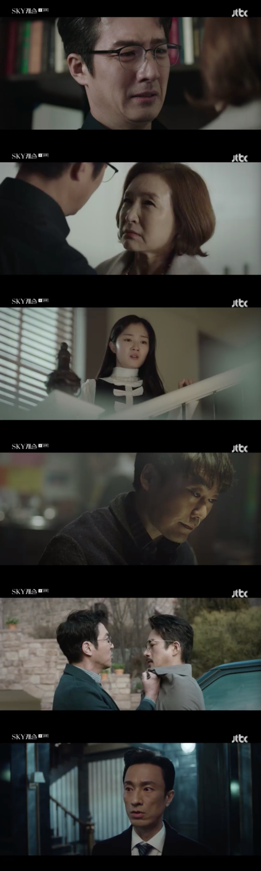 19일 오후 방송된 종합편성채널 JTBC 금토드라마 ‘SKY 캐슬’(극본 유현미, 연출 조현탁) 18회에서는 강준상(정준호 분)이 김주영(김서형 분)의 악행을 알게 됐지만 한서진(염정아 분)가 막으면서 신고하지 못했다.