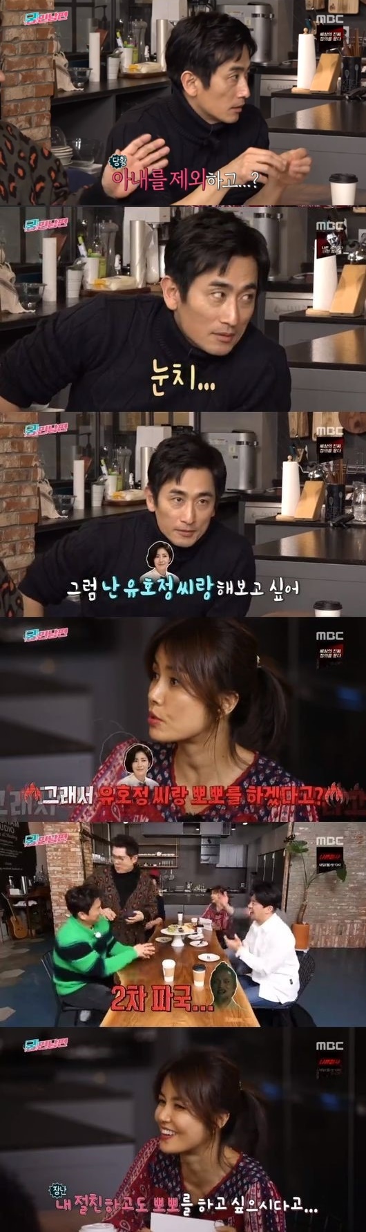 "키스신 찍고 싶은 배우가 누구냐?"는 질문이 나왔고, 눈치를 보던 차인표는 "아내를 제외하면 유호정 씨와 해보고 싶다. 작품에서 연기도 잘하고, 우리 와이프와 절친이다"고 했다. 신애라는 "난 의외다. 유호정과 뽀뽀를 하겠다고. 내 절친하고도 뽀뽀를 하고 싶다고 하다니"라며 웃었다. 차인표는 "여보, 이제 가라"며 당황해 웃음을 안겼다.