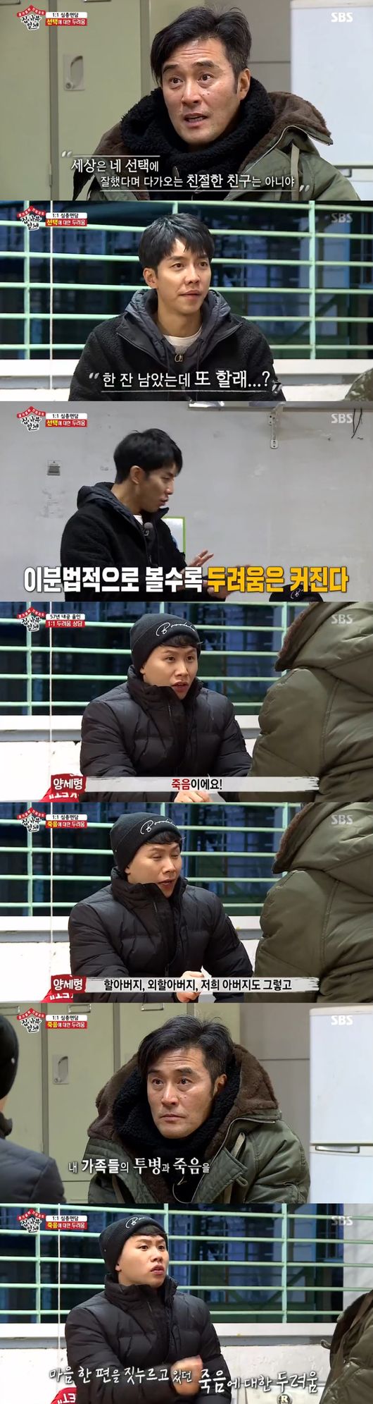 양세형은 "죽음에 대한 두려움이 있다"면서 가족들이 다 단명을 했다고 했다. 가족들의 투병과 죽음을 가까이에서지켜보면서 자연스레 커져간 두려움이 존재한다고 조심스럽게 전했다. 새형은 "결혼을 하고 가족을 꾸렸을 때 내 아이가 나처럼 두려움을 안고 살까봐"라면서 마음 한 편을 짓누르고 있던 죽음에 대해 전했다.