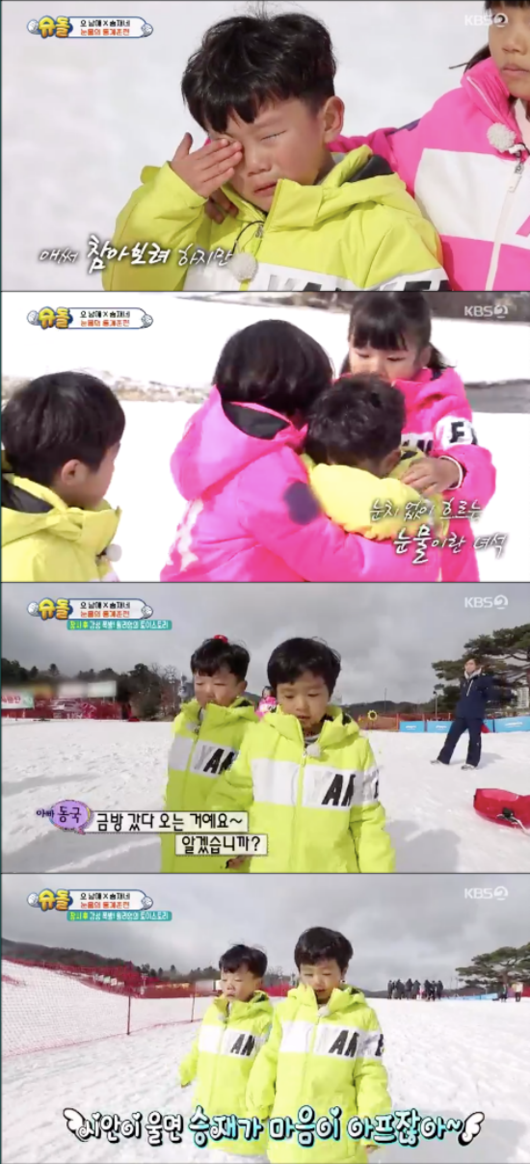 승재는 그런 시안이를 달랜 후 이동국에게 "시안이와 화장실을 다녀오겠다"라고 말했고, 시안이에게 "시안아. 울지 마. 내가 마음이 아프잖아"라면서 "우리 놀러 가자. 훈련 끝나서 거짓말 한 거야"라고 말해 웃음을 안겼다. 이들은 함께 감자튀김을 먹으며 우정을 쌓았다.