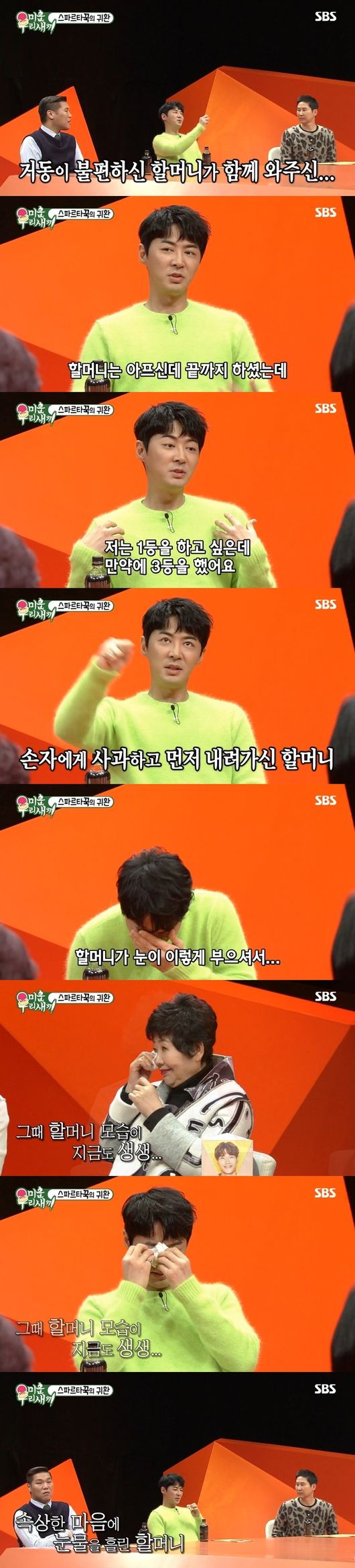 전진은 "어린 시절 뒷산으로 소풍을 갔는데, 할머니가 다리를 절뚝 거리면서 오셨다. '왜 이렇게 늦게 왔냐'고 화를 냈는데, 그 다리로 달리기도 하셨다. 그런데 할머니가 느려서 1등을 못했다고 짜증냈다. 나중에 놀다가 할머니를 만났는데, 눈이 퉁퉁 부으셨더라. 속상한 마음에 많이 우셨다. 엄마 없는 내 모습을 보면서 마음이 아프셨던 것 같다"며 말을 잇지 못한 채 눈물을 쏟았다.