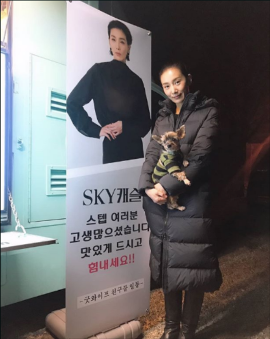 사진 속 김서형은 반려견과 함께 검은색 패딩을 입고 깜찍한 표정을 지었다.