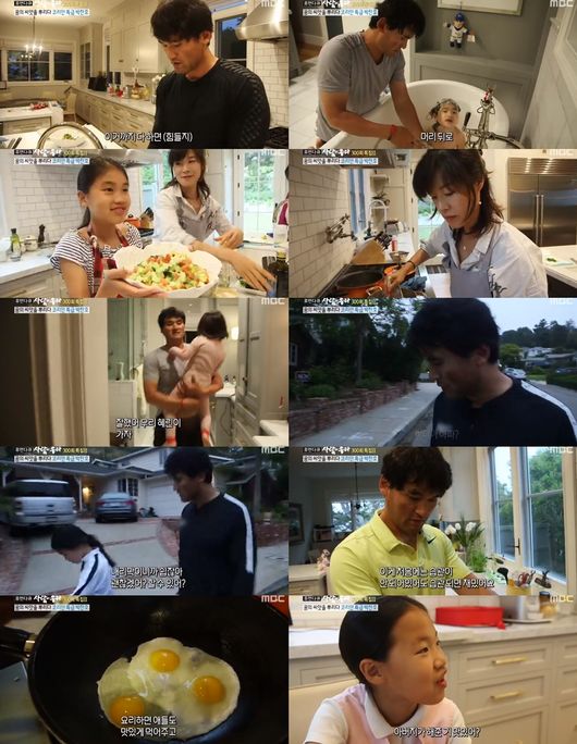 식사 후 설거지는 박찬호 담당. 그는 "아내가 이것까지 하면 하루 종일 여기 있는 거라서 힘들다. 이건 내가 한다"고 말했다. 이어 딸에게 "아버지 설거지 선수지"라며 미소를 지었다.