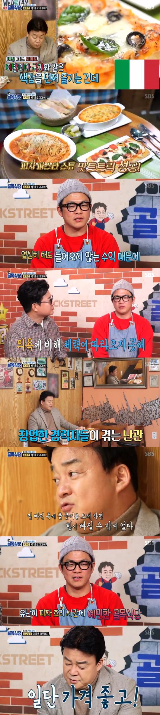 가게에 혼자 남은 백종원은 "그동안 피자에 배신당했던 것 생각하면 눈물나려 한다"면서 "맛있다, 그래 이게 피자지"라고 호평했다. 18년 직원 경력의 빛을 발하는 순간인 것. 백종원은 "이로써 피자와의 악연은 끝이다"면서 "걱정 안해도 될 것 같다"고 했다. 사장은 "식감 뿐만 아니라 들고 먹을 수 있게 의도적으로 밑을 바삭하게 했다"고 했다.피자가 합격한 상황, 백종원은 파스타도 시식했다. 칭찬이 연발, 스튜까지 완벽했다.