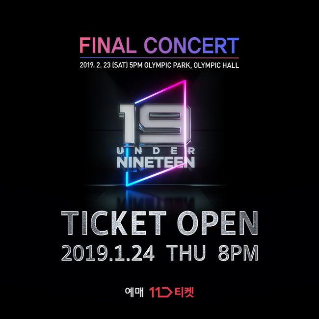 오는 2월 2일까지 데뷔조 그룹명 공모도 받고 있는 ‘언더나인틴’의 ‘FINAL CONCERT’는 2월 23일 오후 5시 올림픽공원 올림픽홀에서 진행되며, 공모 당첨자에겐 ‘FINAL CONCERT’의 VIP로 입장할 수 있는 초대권이 주어진다.