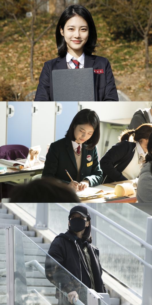 먼저 뽀얀 피부를 더욱 돋보이게 하는 검은 생머리와 찰떡같이 어울리는 교복 그리고 탄산수같이 톡 튀는 싱그러운 미소가 시청자들의 심장을 두드리고 있다. 반듯한 자세로 필기 모드에 집중한 모습과 여유로움이 느껴지는 아우라는 세상 사람들에게 완벽함 그 자체로 여겨지는 학교 안 모범생 윤재인의 모습을 고스란히 보여주고 있어 더욱 눈길을 끌고 있다.