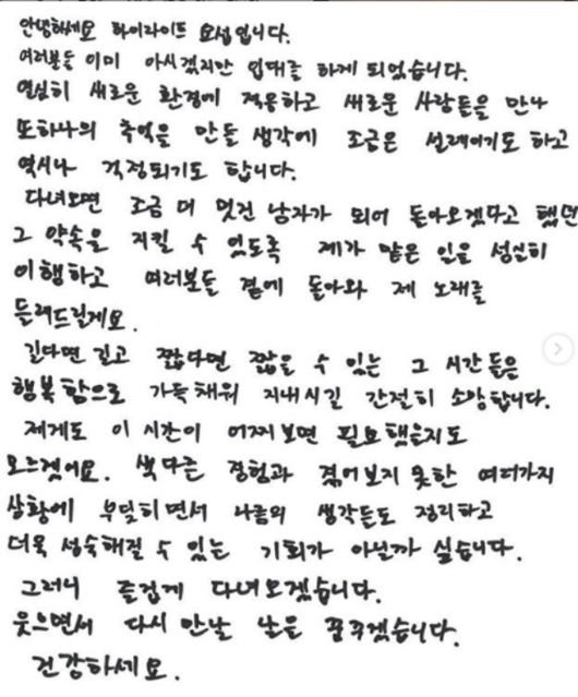 이어 "여러분들 잘 지내시길 바란다. 너무 안슬퍼하셔도 될 것 같다. 소식들 금방 금방 전해드릴 것이다"라며 "어제 사실 많이 못잤다. 이게 걱정이 되서 잠을 못잔 것도 있지만 새로운 환경에 놓일 생각에 설레기도 한다. 물론 그 설레임이 얼마나 갈지 모르겠다. 아주 즐겁게 잘 지내다 오겠다”라고 밝혔다.
