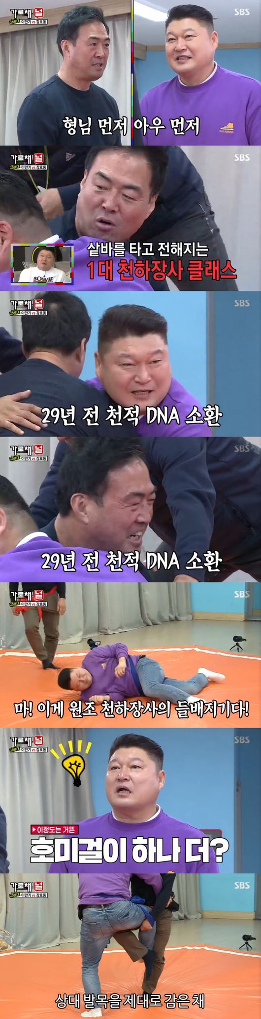 이만기는 "할 줄 모르면 내가 다친다"며 입씨름에서 압승했다. 강호동은 "씨름으로 무시당하기 처음"이라며 천적의 모습을 보였다. 29년만에 레전드 라이벌의 리매치가 성사됐다. 아직 끝나지 않은 두 승부사의 역사가 시작된 것. 이만기는 바로 강호동을 엎었다. 이어 호미걸이 기술까지 전수했다. 강호동이 유독 힘들어 하자, 이만기는 "메인경기 남았다, 힘 빼려고 그랬다"고 말해 강호동을 제압했다.