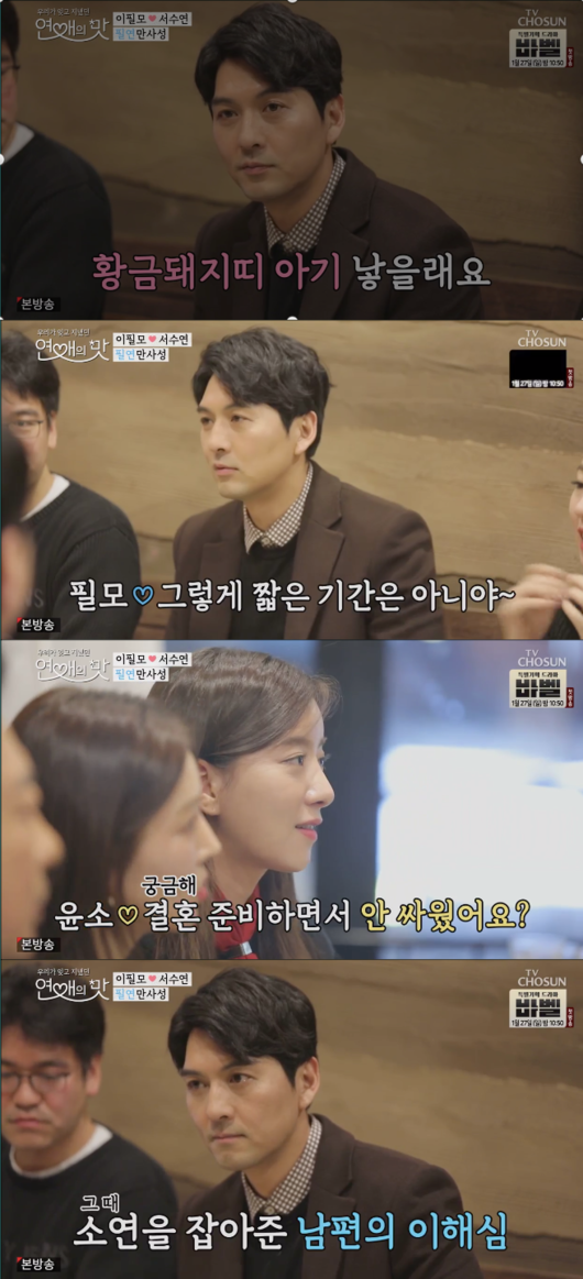 지난 24일 방영된 TV조선 ‘연애의 맛’에서 이필모와 서수연은 한 식당에서 함께 드라마를 촬영했던 ‘가화만사성’ 배우들과 제작진을 만났다. 이날 김소연, 윤소, 김지호, 윤다훈, 소희정, 이동윤 PD 등이 참석했다.