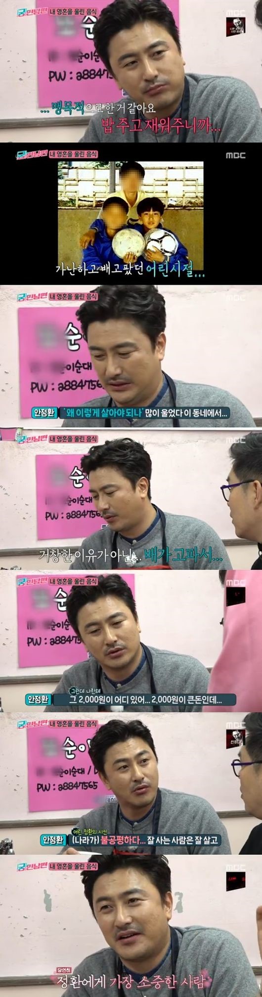 안정환의 불우한 가정사는 대중들에게도 너무나 유명한 일이기 때문. 안정환은 지난해 12월 방영된 MBC ‘궁민남편’에 출연해서 불우했던 과거를 떠올렸다. 순대타운으로 멤버들을 이끈 안정환은 과거 만원이 없어서 외상빚을 갚지 못했던 사연을 털어놨다. 안정환은 “이 동네에서 초, 중, 고를 나왔다. 진짜 어려운 동네였다. '나는 왜 이러고 살아야 하냐'면서 이 동네에서 많이 울었다. 배고플 때 제일 절망적이었다. 축구한 이유도 배고파서였다. 내일이 없었다. 정말 절망적인 날들이었다. 그래서 오히려 내가 더 잘 돼야겠다 하면서 오기를 냈다"고 고백했다.
