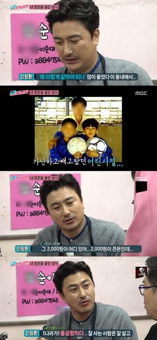 안정환은 현재 출연 중인 MBC 예능프로그램 '궁민남편'에서도 "난 아버지 얼굴도 모른다. 대학교 들어가기 전까지 할머니와 옥탑방에서 살았다"며 "꾀죄죄하게 다니던 날 보며 순대 파는 할머니들이 순대 꽁다리를 쥐어주곤 했다. 내가 살던 동네가 진짜 어려운 동네였는데, '난 왜 이러고 살아야 하나' 생각하면서 많이 울었다. 배고플 때 제일 절망적이었다. 축구한 이유도 배고파서였다. 내일이 없었고, 절망적인 날들이었다. 그래서 오히려 내가 더 잘 돼야겠다 생각했고, 오기를 냈다"고 털어놨다.