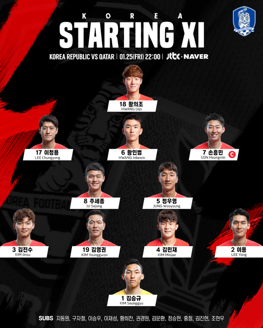 기성용(뉴캐슬)이 떠난 중원에는 정우영(알사드)과 주세종(아산)이 나선다. 황인범(대전)이 2선 공격형 미드필더로 나선다. 포백은 김진수(전북)-김영권(광저우)-김민재(전북)-이용(전북)이 구축했다. 선발 골키퍼는 김승규(빗셀 고베).