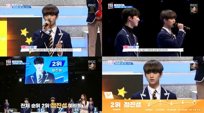 이날 보컬 파트 예비돌 정진성은 4차 순위 발표식에서 전체 2위를 기록, 데뷔조를 향한 높은 가능성 속 파이널 생방송 무대에 오르게 됐다. 2위를 차지한 정진성은 “감사하다”고 소감을 전했다.