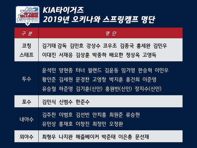 KIA는 오는 31일 일본으로 출국해 2월 1일부터 3월 9일까지 오키나와(킨 구장)에서 스프링캠프를 운영한다. 이번 스프링캠프에는 김기태 감독을 비롯한 코칭스태프 14명, 선수 40명 등 54명의 선수단이 참가한다.