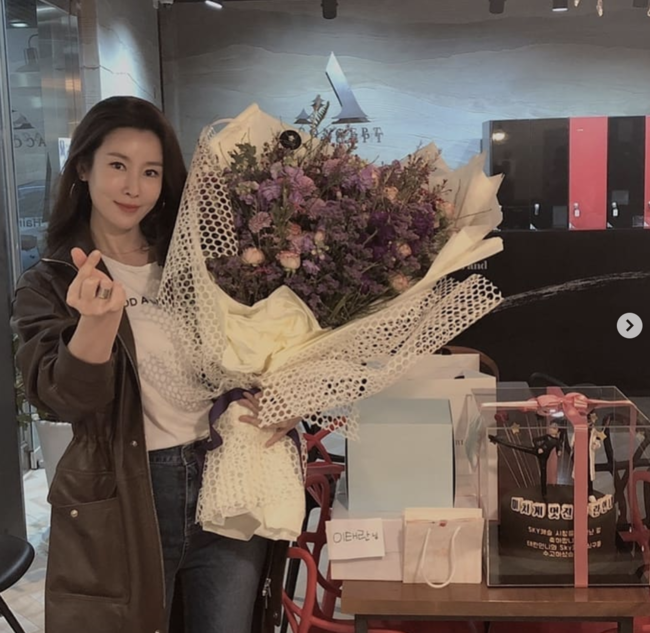 공개된 사진 속 이태란은 팬들의 응원을 받고 환한 미소를 짓고 있다. 커다란 꽃다발을 들고 카메라를 향해 손가락 하트를 보이기도.