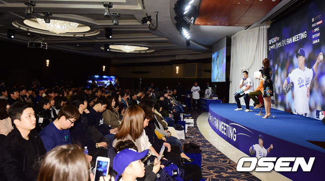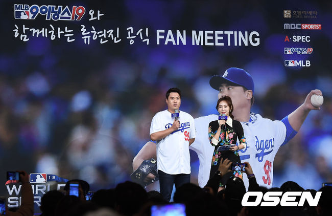 ‘MLB9이닝스19’와 함께 하는 류현진 공식 팬미팅이 27일 오후 서울 청담동 리베라호텔에서 개최됐다. SNS를 통해 참가신청을 한 300명의 팬들이 모였다. 류현진은 다저스 공식 팬페스트 행사를 마다하고 한국에서 팬들과 만나 즐거운 시간을 가졌다.