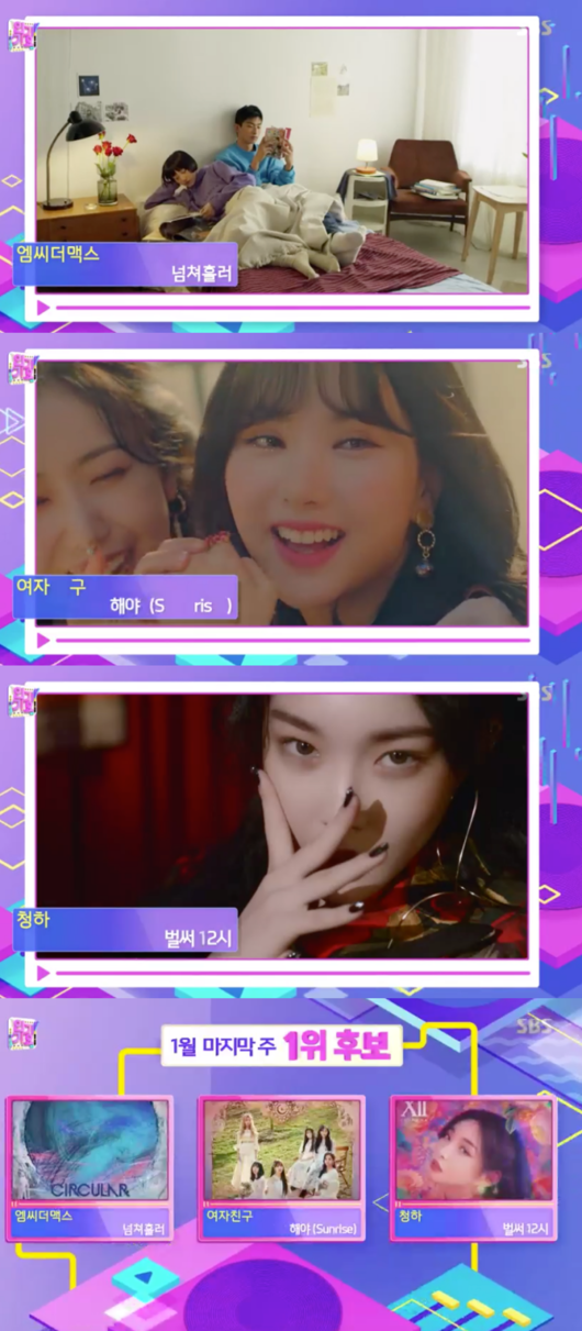엠씨더맥스, 여자친구, 청하가 ‘인기가요’ 1월 마지막 주 1위후보에 올랐다.