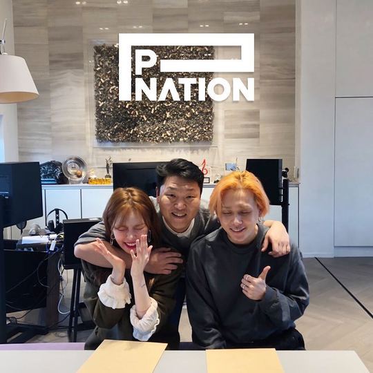 싸이는 27일 자신의 SNS에 "#welcome @hyunah_aa @hyojong_1994 #hyunah #edawn #pnation #피네이션"이란 글을 게재했다.