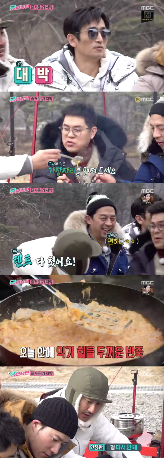 멤버들은 마장호수로 향했다. 본격적으로 텐트를 친 김용만은 멤버들에게 “다섯 명도 잔다”고 말했다. 고개만 돌리면 뽀뽀가 가능하다는 멤버들의 원성에 김용만은 우애를 다질 수 있는 기회라고 했다. 이어 음식을 만들기 시작한 김용만은 삼겹살 김치전, 오믈렛을 선보였다. 이어 그는 태양열 군고구마를 꺼냈다. 안정환은 “형 해가 없지 않냐. 만약 해가 없는데 이게 익으면 내가 산다”고 말했다. 김용만은 “해가 없으니까 20분 정도 걸린다. 벌써 뜨겁다”며 자신만만했다. 그 순간 해가 나타났다.