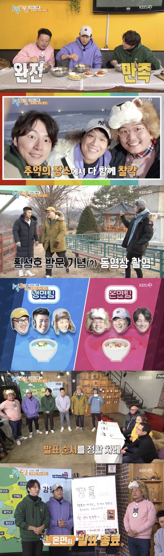 이어 냉면팀은 '우리 셋 힐링 투어'라는 타이틀로 봉평 한우 메밀 싹 육회 비빔국수, 원주 초계국수, 횡성 건진국수, 횡성호를 소개해 흥미를 유발했다. 이욱정 PD는 "온면팀 보다 더 빈약한 스토리"라고 아쉬워했다. 하지만 반전으로 냉면팀이 215점을 획득하며 승리를 거뒀다.