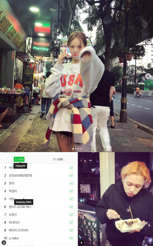 현아는 27일 오후 자신의 SNS에 싸이, 현아, 이던, 피네이션이 차례로 실시간 검색어 순위에 오른 모습을 캡처해 게재했다. 이후 그녀의 SNS는 평소와 다름 없이 공개연인인 이던과의 자유로운 데이트 사진과 영상이 올라왔다.
