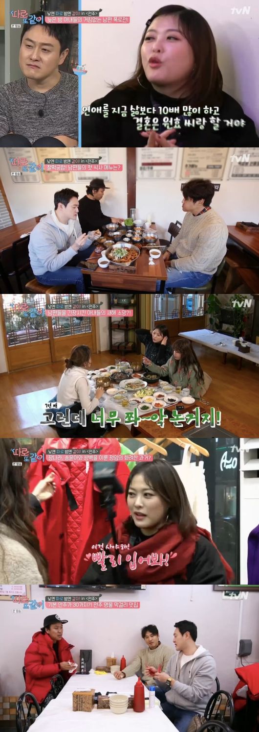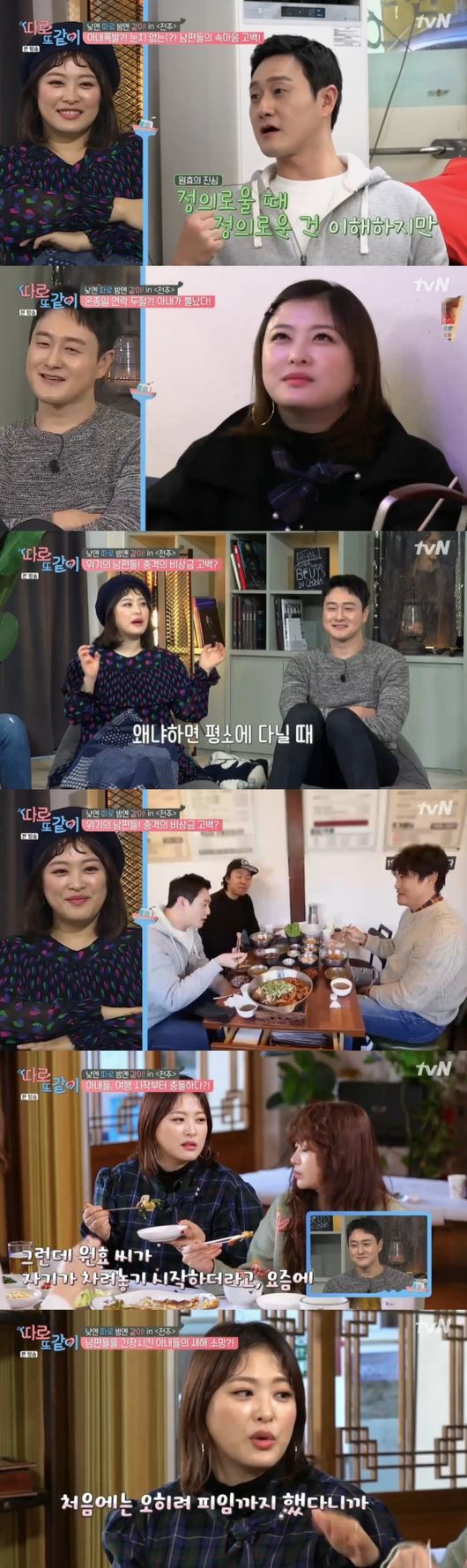 27일 방송된 tvN 예능 ‘따로 또 같이’에서는 김원효 심진화 부부가 홍성흔 김정임 부부, 허영란 김기환 부부와 ‘맛의 도시’ 전주를 여행하는 모습이 담겼다.