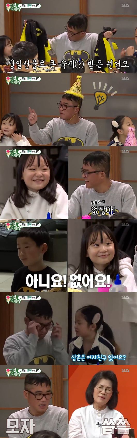 김건모는 아홉살 아이들의 연애소식을 듣곤 흥미로워했다. 이어 "마음에 안 드는 것 있냐"며 질투, 아이들은 "없다"면서 "좋은 점이 너무 많다"고 빠르게 대답했다. 거꾸로 아이들은 김건모에게 여자친구 있는지 질문, 김건모는 "없다"면서 자신이 왜 여자친구 없을지 이유를 물었다. 아이들은 "나이가 많아서, 인기가 없어서 그런다"며 솔직하면서도 천진난만한 대답으로 배꼽을 잡게 했다.