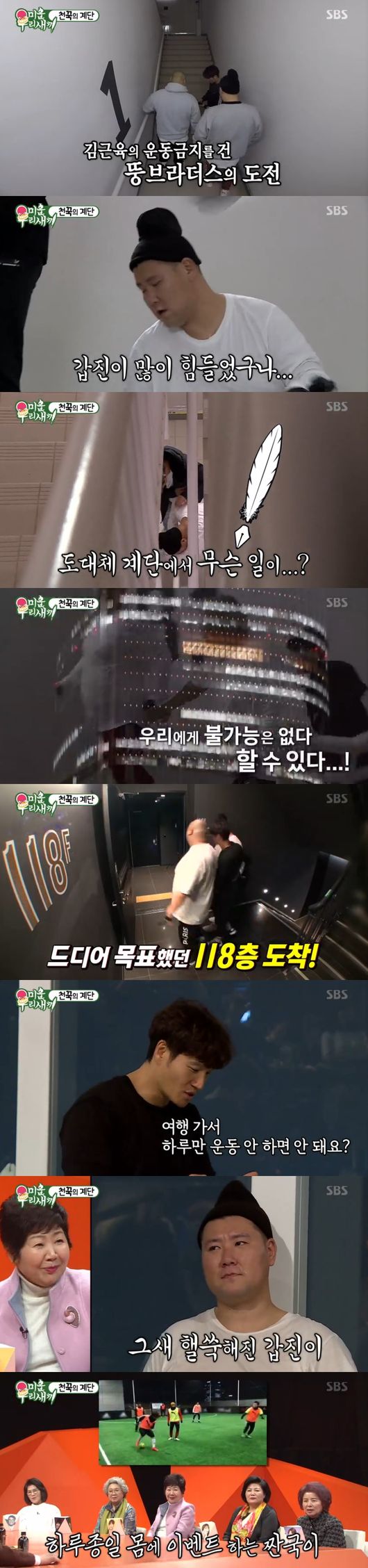 목표였던 118층 전망대까지 올랐다. 운동에 이어 명언까지 폭발했다. 그림처럼 펼쳐진 서울의 야경에 모두 감탄했다. 하지만 1시간 10분 걸린 탓에 김종국이 승리, 김종국은 "좋아하는 운동 계속하겠다"면서 고생한 동생들에겐 "완주했으나 조만간 먹방투어하겠다"고 약속했다. 완주한 동생들을 기특해했다.