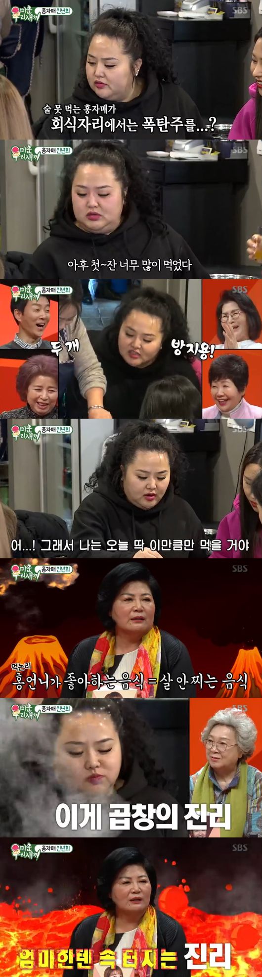 이렇게 먹으면 치즈크러스트 피자씹는 기분"이라며 손가락 크기만한 사이즈로 곱창을 잘라 배꼽을 잡게 했다. 홍진영은 언니에게 올해부터 다이어트를 언급, 홍언니는 "고단백 저칼로리 많이 먹어도 살 안 찔 것"이라며 자기 합리화를 했다. 이를 본 母는 "자기가 먹고싶은건 살이 안 찐다고 한다"고 말해 웃음을 안겼다.