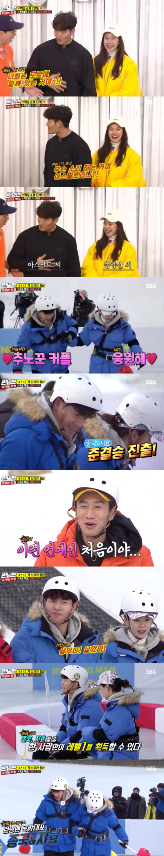 첫 번째 커플 게임은 얼음 위 커플 추격 게임인 ‘게 섰거라 풍선’. 이 때 김종국과 송지효가 손을 잡고 빙판 위를 달리자 응원하던 멤버들은 쉴 새 없이 놀려댔다. 두 사람이 트랙을 돌아 자신들 앞에 올 때마다 ‘회상’과 ‘한남자’를 부르며 핑크빛 기류를 형성했다. 김종국과 송지효는 수줍게 웃을 수밖에.
