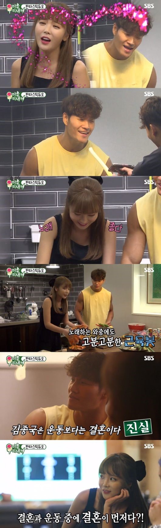 김종국은 ‘런닝맨’ 이후 방송되는 ‘미운우리새끼’에선 홍진영과 러브라인을 형성했던 바다. 휴가를 떠난 김종국은 홍진영과 함께 요리를 만들며 즐거운 시간을 보냈고 노래를 불러 달라는 요청까지도 들어줬다. MC 서장훈이 "김종국은 아무리 친한 형들이 요청해도 절대 노래를 불러주지 않는다"고 놀라워할 정도.