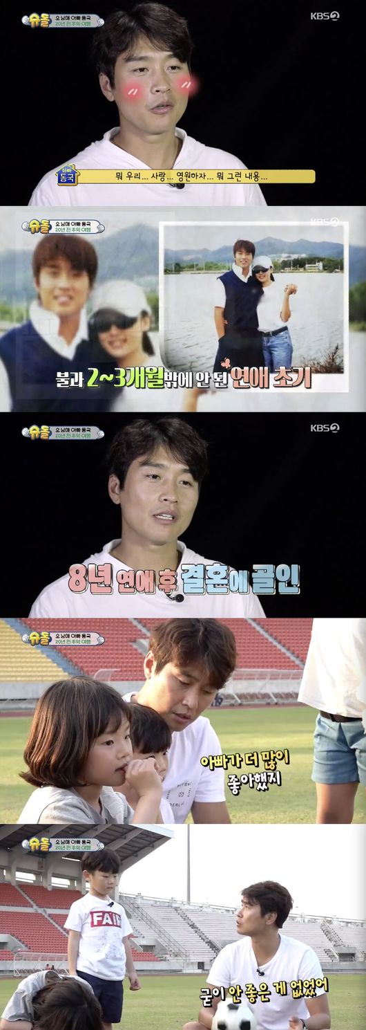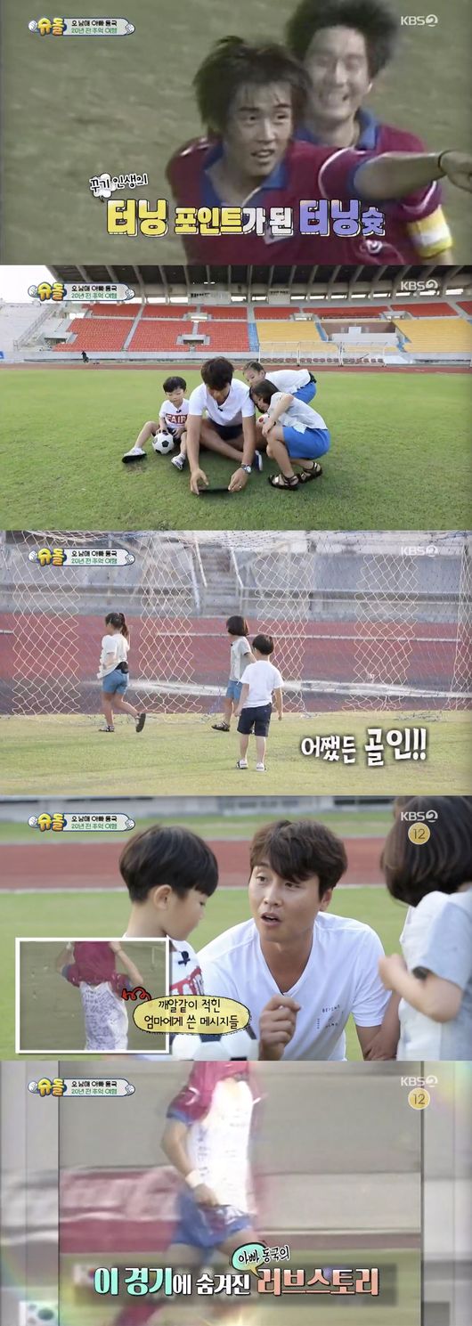 이동국은 축구장에서 아이들과 축국를 하고 당시 골을 넣는 장면을 보며 남다른 감회에 젖었다. 당시 이동국은 골 세레머니로 글씨가 빼곡히 적인 옷을 공개한 바 있다. 이는 지금의 아내와의 연애시절 아내를 향해 하고 싶은 이야기를 적어 놓았던 것. 이동국은 "잘 기억은 안나는데 뭐 우리 사랑 영원하자 그런 내용이었던 것 같다"고 쑥쓰러운 듯 말했다.