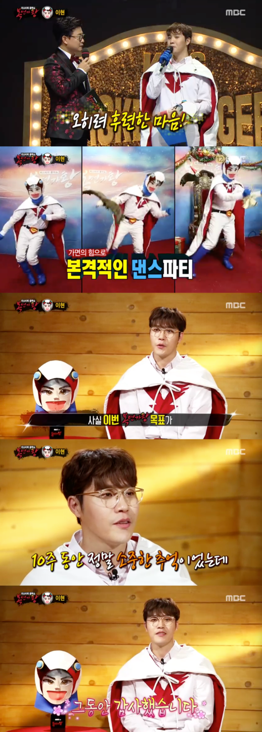 이전까지 자리를 지키던 ‘독수리 건'의 정체는 이현으로 밝혀졌다. 이현은 “아쉽지 않고 후련하다”며 “‘복면가왕’에 고마운 게 편견을 깨고자 하는 프로그램인데 이번 재도전을 통해 대중의 편견을 깬다기 보다는 제 자신에 대한 편견을 깨고 싶었다. 자신감도 없었고 제 탓으로 돌렸었다. 여기까지 응원해주셔서 감사드린다”고 밝혔다. 이어 “처음으로 샀던 레코드가 윤상 선배님의 1집이었다. 제가 어렸을 때 큰 작곡가였던 분이 지금의 저를 보시면 어떻게 느끼실까 궁금했다. 좋은 말과 솔직한 말을 많이 해주셔서 (감사하다)”라고 덧붙였다.