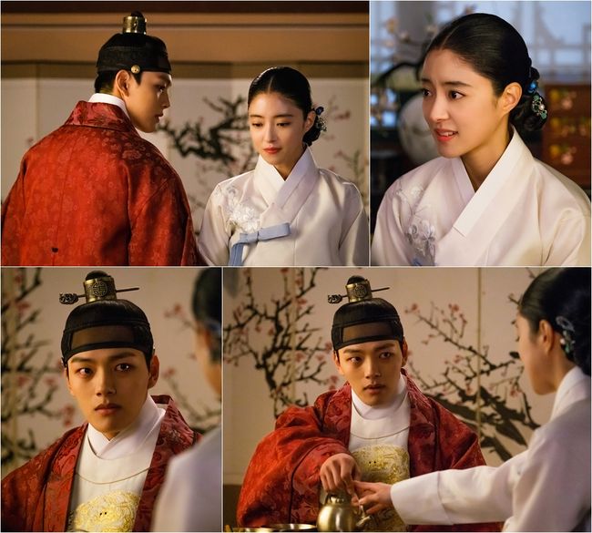 공개된 스틸 속에는 살얼음판처럼 아슬아슬한 분위기를 풍기고 있는 부부의 모습이 담겨 있어 이목을 단숨에 사로잡는다. 여진구와 이세영은 침소의대(궁중에서 왕이나 왕비가 침소에 들 때 입는 잠옷을 이르는 말) 차림으로 중궁전 처소에 함께 있다. 새색시처럼 수줍은 미소로 맞이하는 이세영과는 달리 여진구는 냉랭하게 그의 곁을 스쳐 지나가는 모습. 뿐만 아니라 여진구는 금방이라도 불꽃이 일 듯 매서운 눈으로 이세영을 노려보고 있고 곧이어 이세영의 말갛던 미소 역시 한순간에 사그라들어 긴장감이 극으로 치솟는다. 이에 이세영이 자신의 눈 앞에 앉아있는 지아비의 정체를 알아차릴지, 동시에 폭군 여진구가 분노하는 이유는 무엇일지 궁금증이 수직 상승한다.